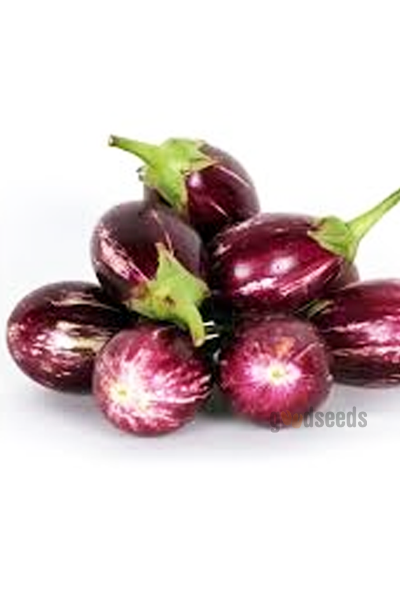 Fresh, local and organically produced round purple brinjal varieties, which may be either striped (varikatri) or darkish purple depending on the farm and availability.